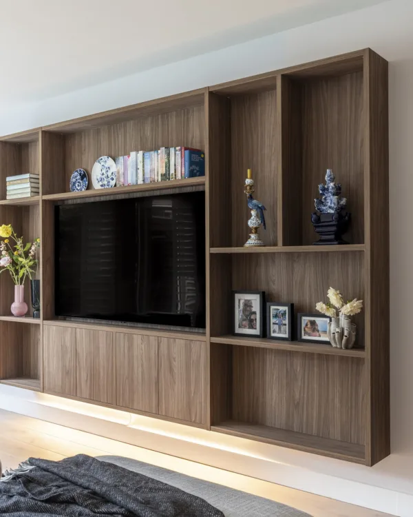Cinewall : un Cinewall est un meuble TV élaboré qui couvre souvent tout le mur. Il offre de nombreux rangements et un espace intégré pour votre télévision. Ce style donne un aspect luxueux et ordonné, souvent avec un éclairage intégré et des étagères supplémentaires pour votre équipement multimédia.
