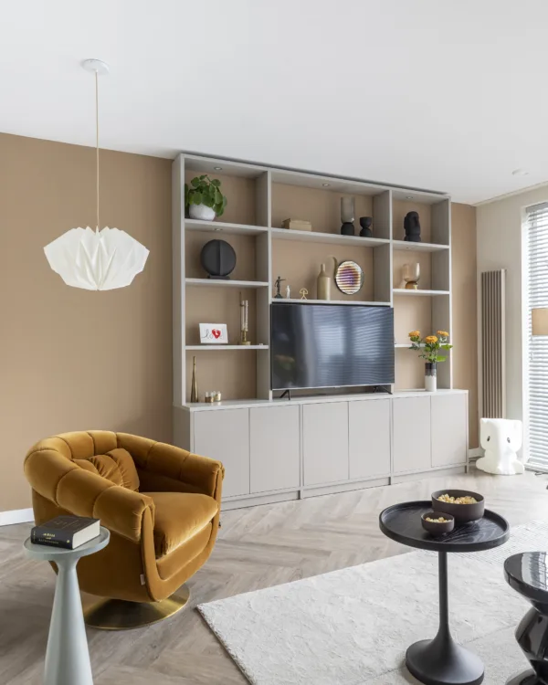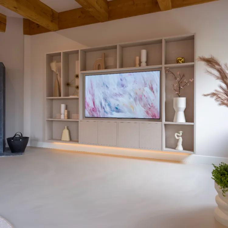 Le Cinewall devient le point central incontournable du salon et de la chambre. Ce n'est pas seulement un endroit pour votre télévision et votre équipement audio, c'est le complément ultime de votre espace. Avec un Cinewall sur mesure, vous pouvez regarder vos films et séries préférés avec beaucoup de style et sans être gêné par les câbles. Parfait pour des soirées cinéma conviviales ou un moment détendu de lecture.