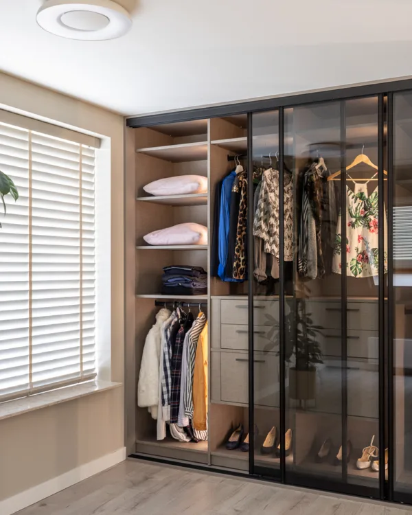 Bien sûr, vous pouvez également fermer l'espace du placard avec l'une de nos magnifiques portes coulissantes. Tant les portes que le dressing sont entièrement faits sur mesure dans votre chambre ou toute autre pièce.