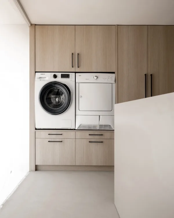 La taille de votre meuble pour machine à laver dépend des dimensions de votre machine à laver et de votre sèche-linge. Mesurez la largeur, la hauteur et la profondeur de vos appareils et venez dans l'un de nos magasins. Nous serons heureux de vous aider à concevoir un meuble sur mesure qui s'adapte parfaitement, avec un espace de rangement supplémentaire pour les produits de lessive, la planche à repasser et autres accessoires.