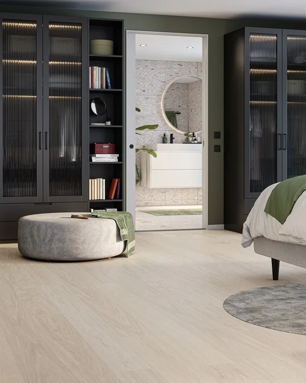 Licht grijze houtlook finerparket vloer in de inloopkast